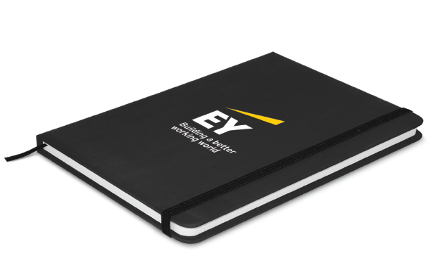 Smart medium-size notebook with 80 leaves (160 pages) of 70gsm lined white paper and a hard cover PU cover. It has an elastic closure band and a bookmark ribbon.